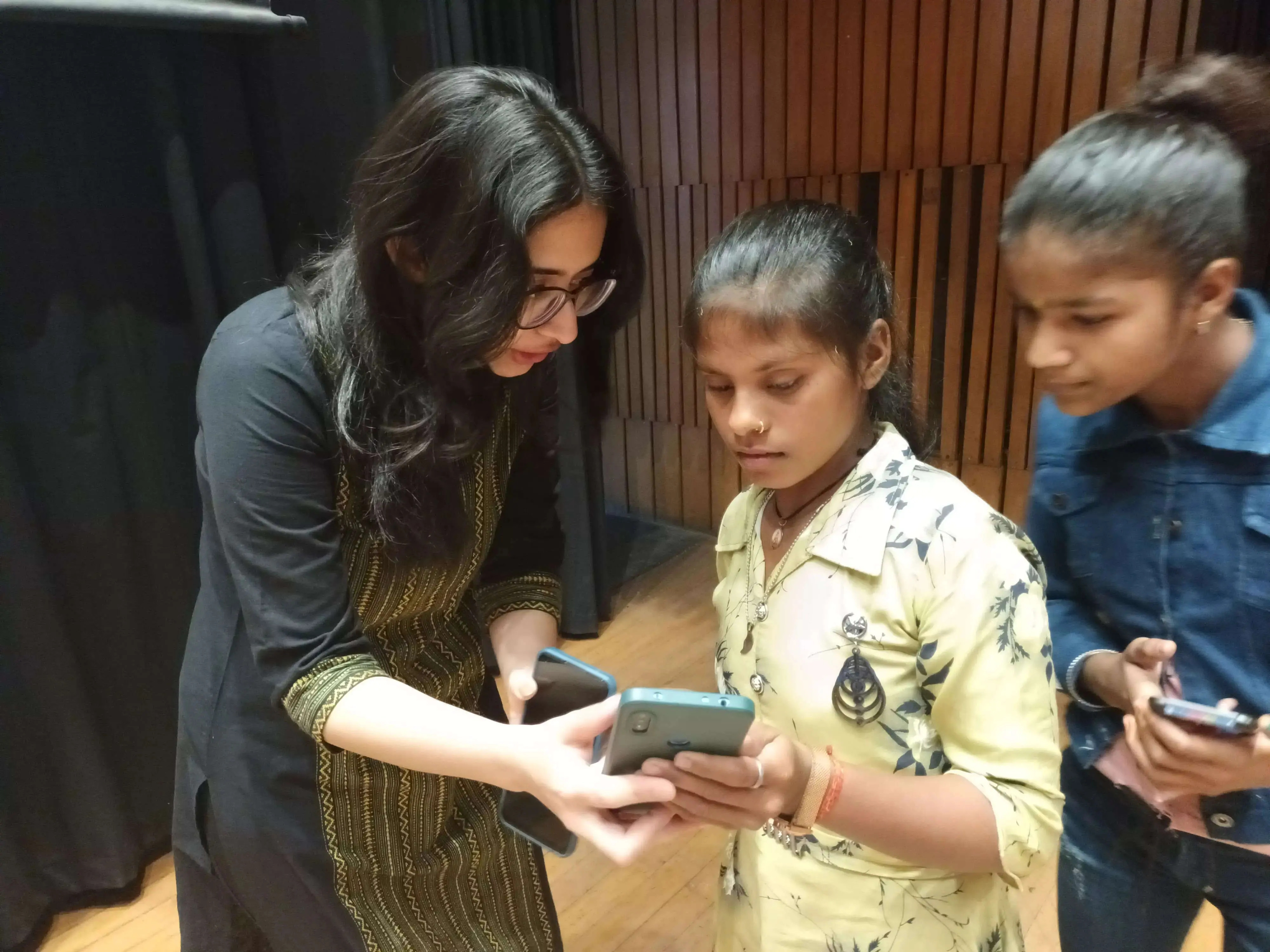 Pragya Singh, a student of Bennett University, teaching filmmaking on mobile phone to girls from tribal areas at the IAWRT workshop held between March 1-3. Photo by Sankalp Gupta