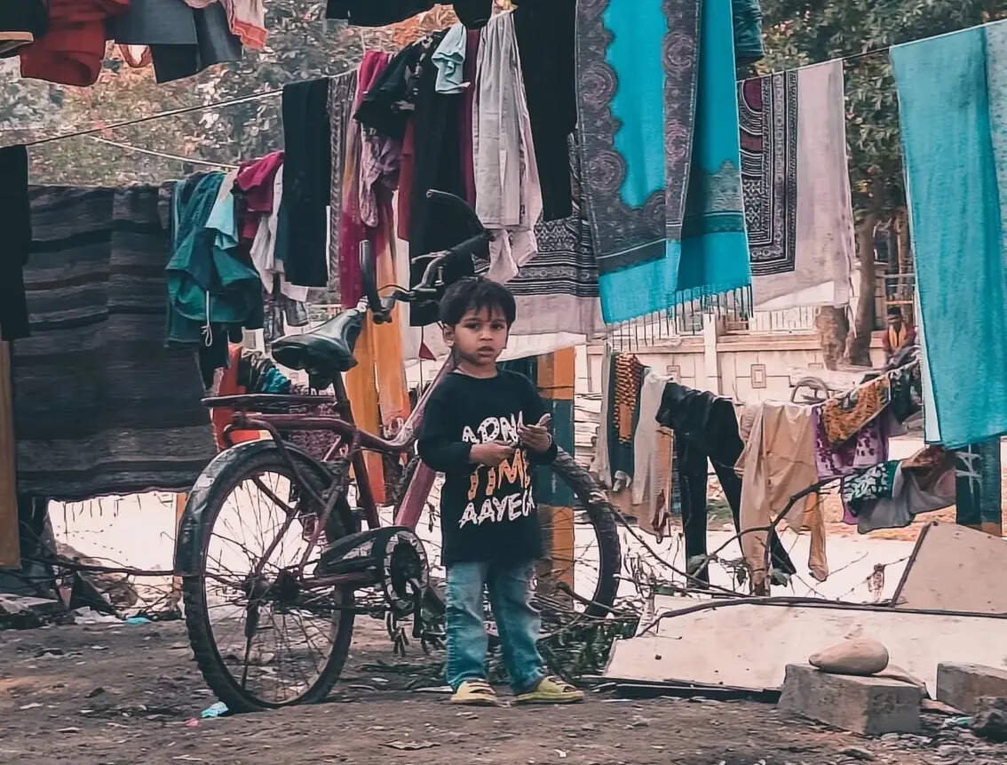 Standing beside a parked bicycle, a young boy stares directly into the lens. Behind him, rows of drying laundry symbolize the domestic life that thrives in the city's alleyways.