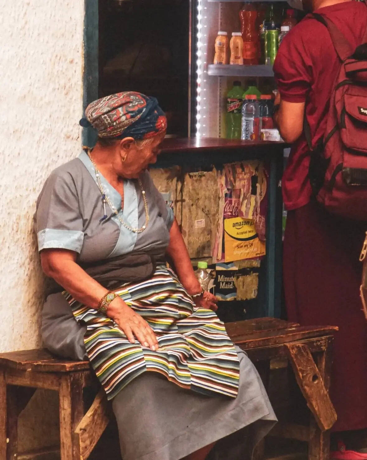 Dressed in traditional patterned textiles, an elderly woman takes a moment of rest on a worn wooden bench. Her posture reflects the quiet endurance found in Delhi's busiest corners.