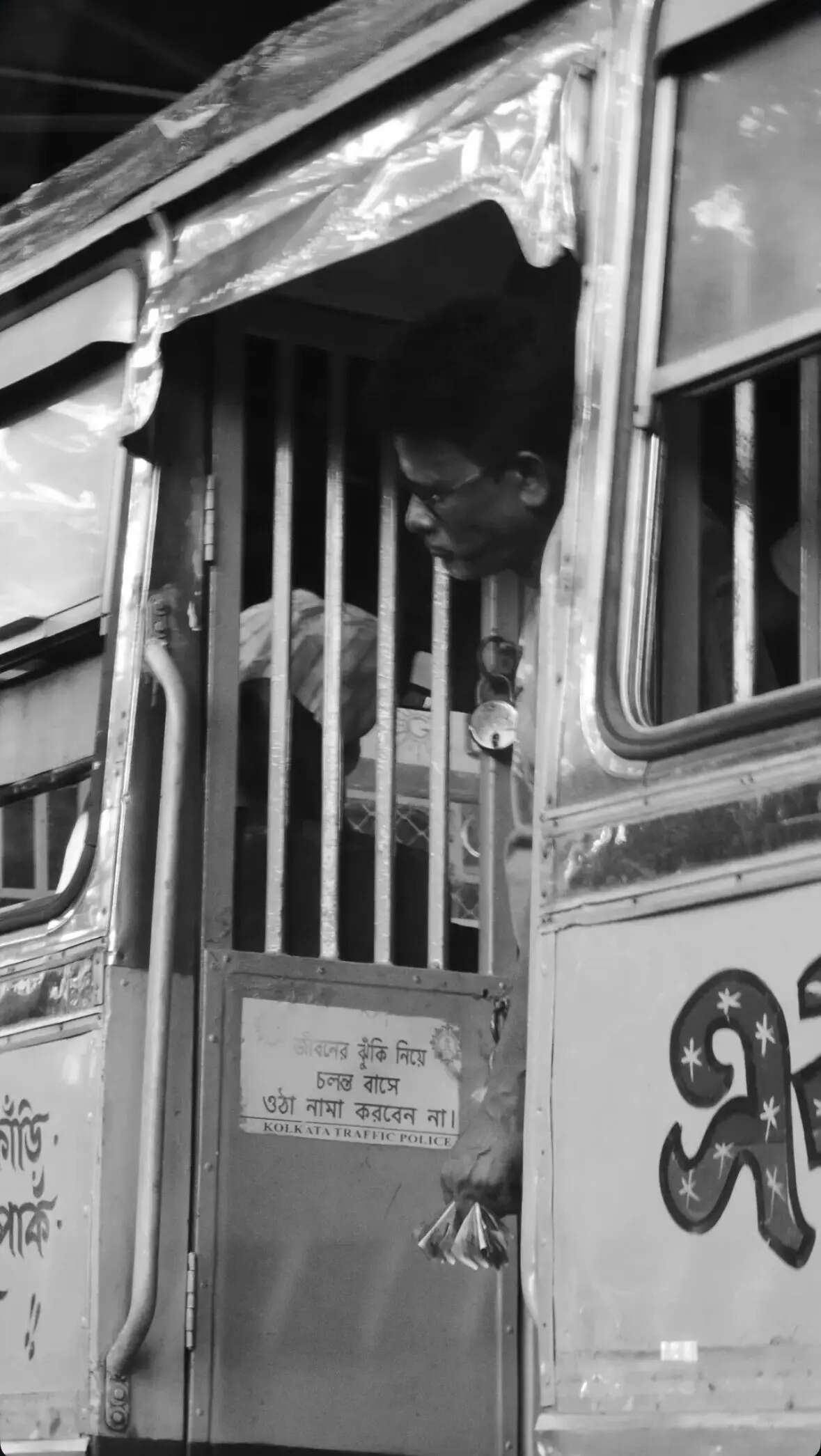 Captured in high-contrast black and white, a passenger looks out through the security bars of a local bus. The image strips away color to focus on the grit and geometry of urban transit.